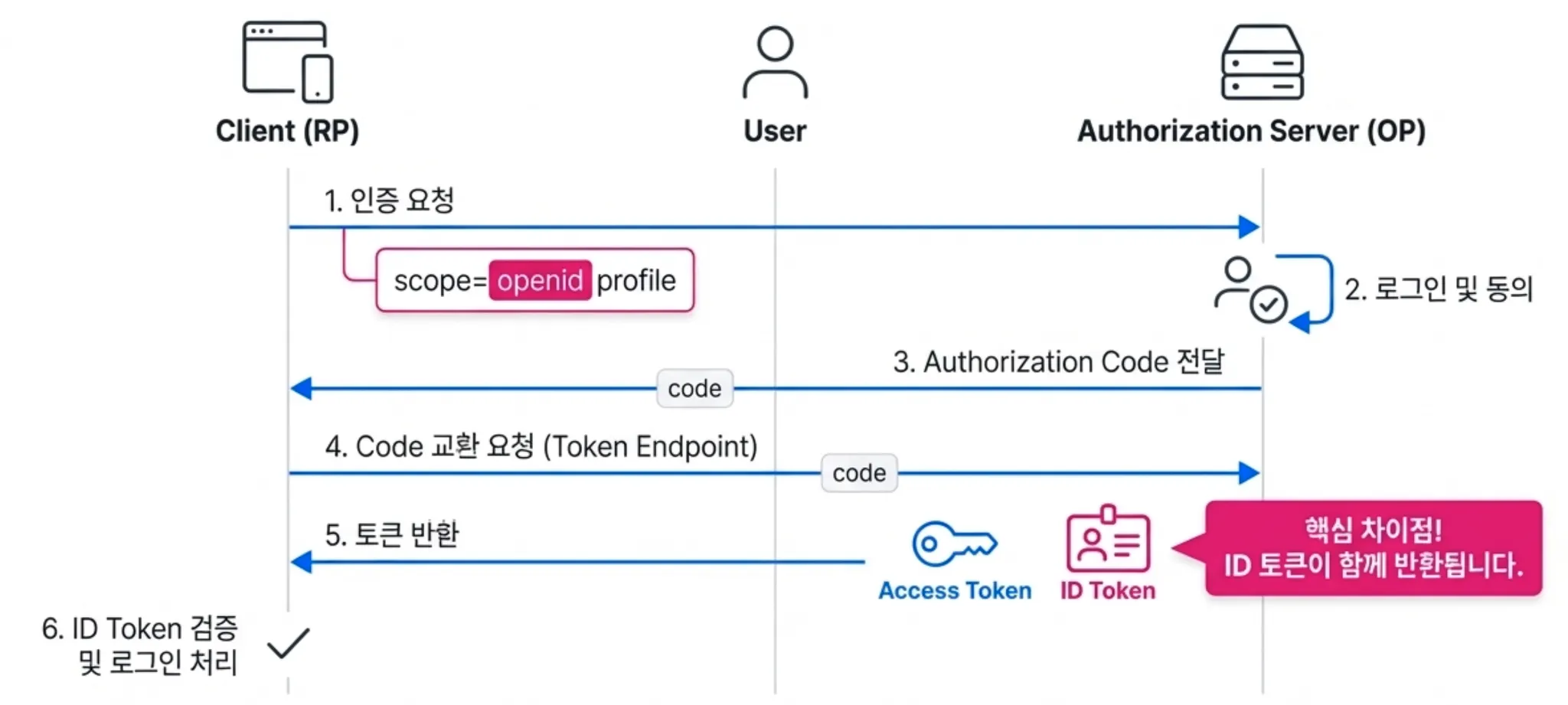 그렇다면 authorization server는 OIDC인지 OAuth인지 어떻게 구별할까요? OAuth 프로토콜 과정에서 scope에 openid를 포함하면 됩니다. authorization server는 scope에 openid가 있으면 OIDC 프로토콜로 인식합니다.