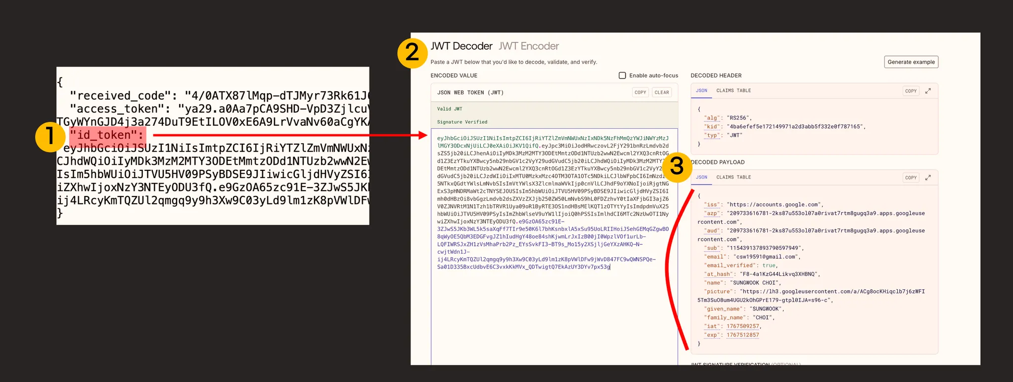 OAuth 핸즈온을 실행하면 받은 id_token을 받을 수 있습니다. id_token은 JWT이고 jwt.io에서 디코딩 할 수 있습니다.