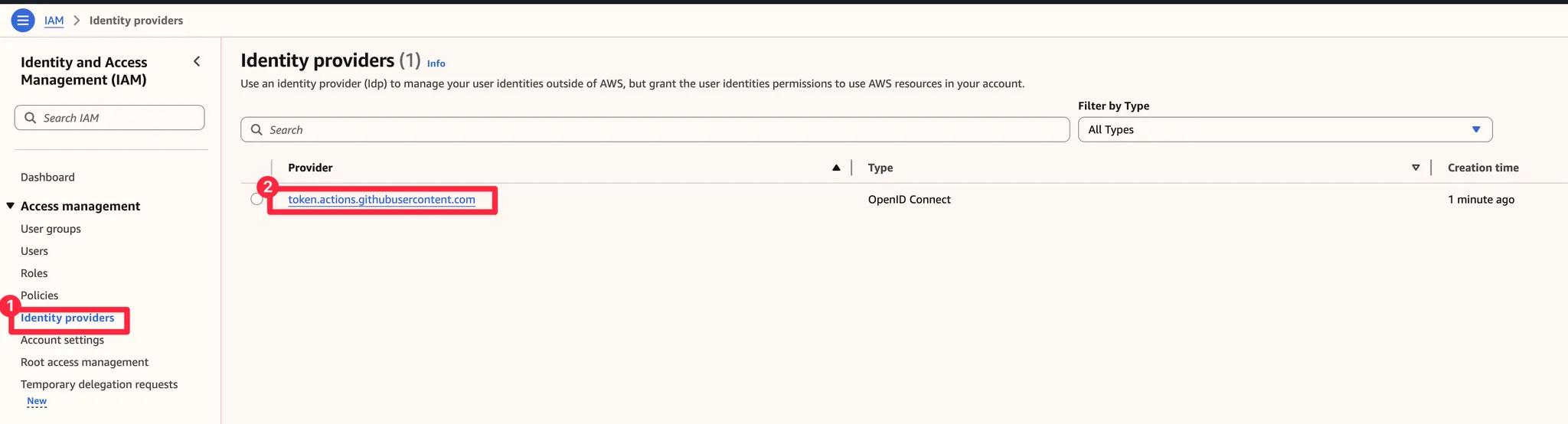 AWS 입장에서 GitHub Authorization Server(IDP)는 AWS 리소스가 아니므로 신뢰(Trust) 설정을 해야 합니다. 신뢰 설정은 IAM Identity Provider에서 할 수 있습니다.