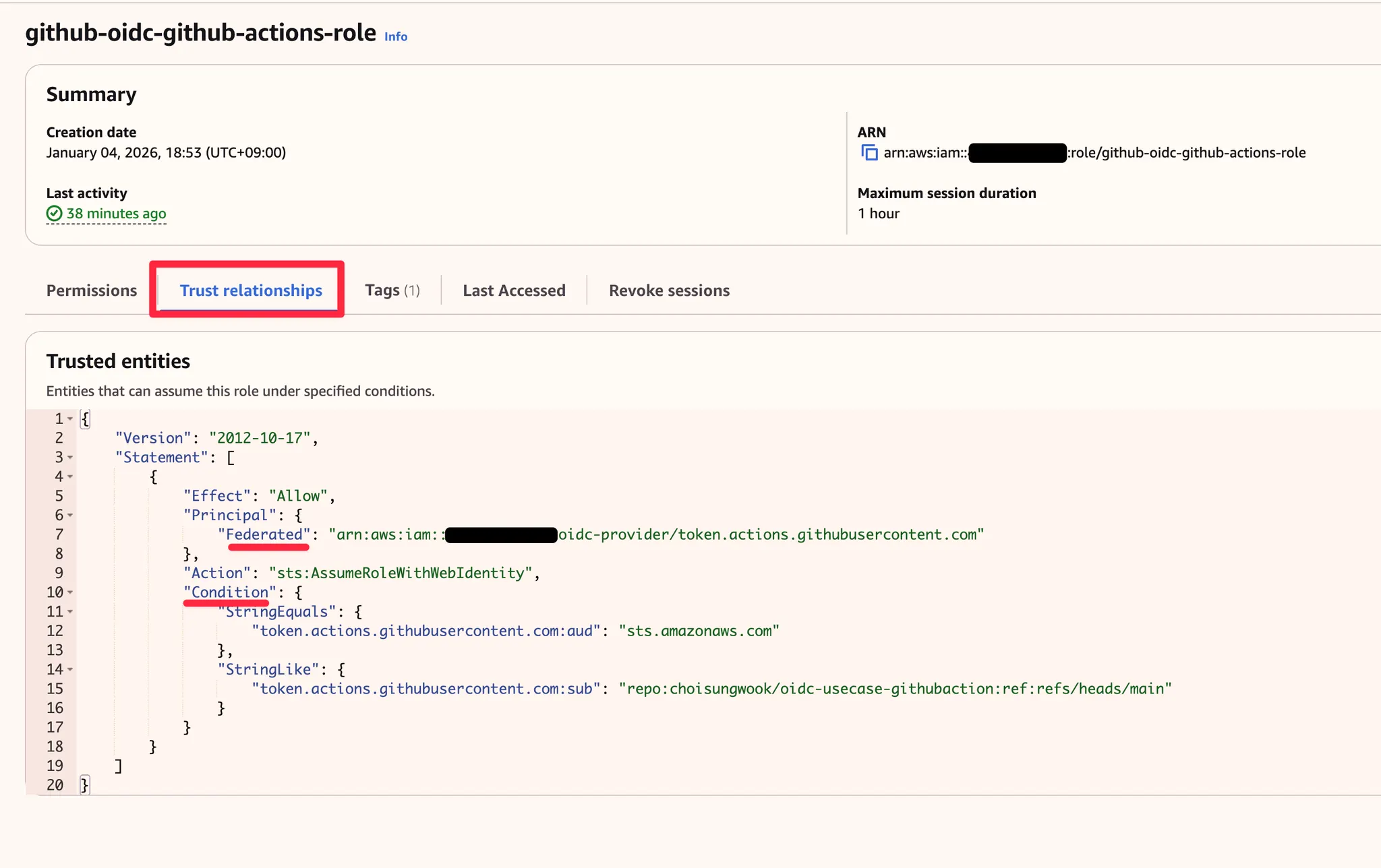 그 외에 GitHub Actions가 사용하는 IAM role에 Trust Relationship 설정도 필요합니다. Trust Relationship 설정에는 assume role을 할 수 있는 GitHub 레포지토리를 한정시킬 수 있습니다.