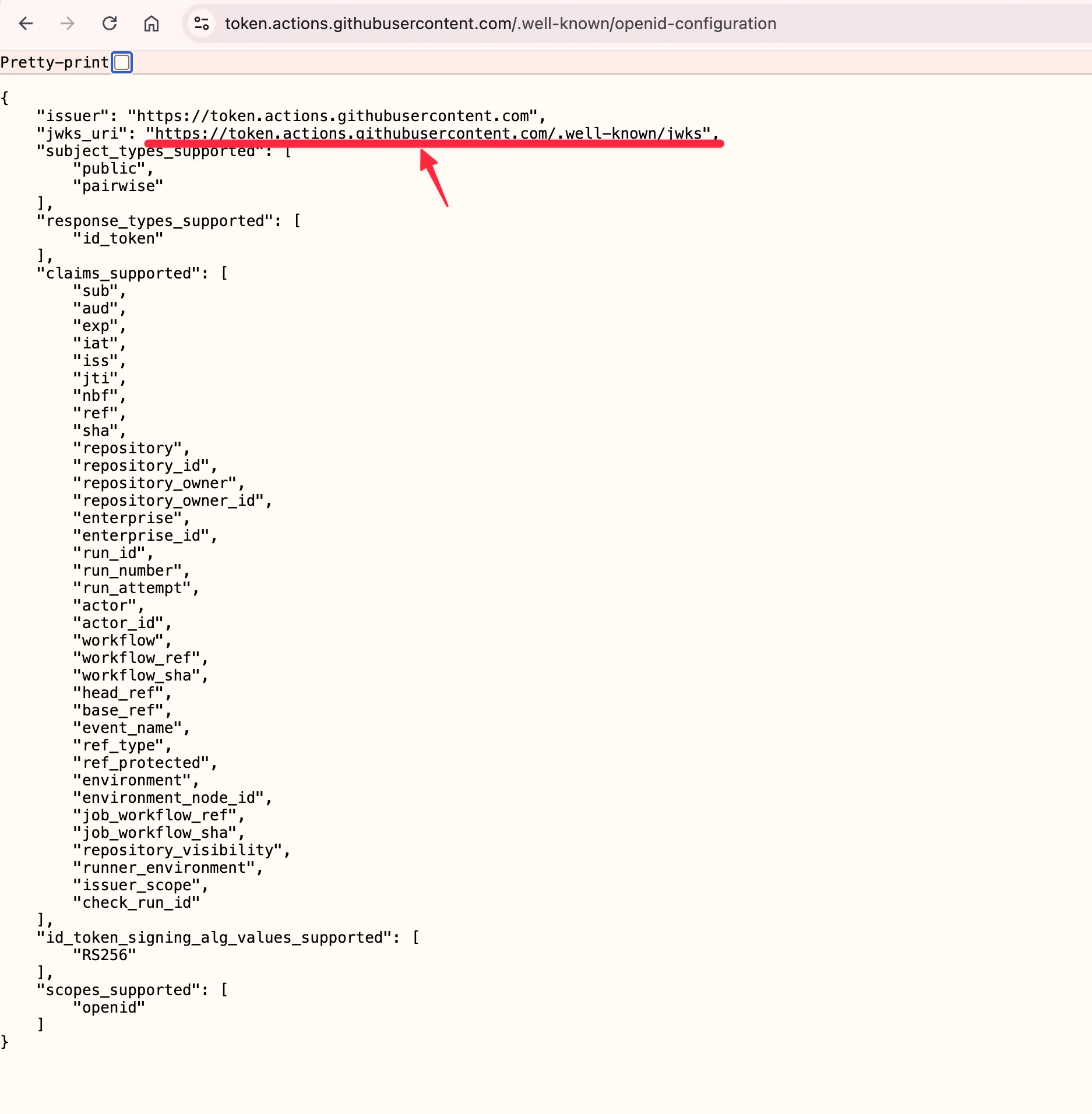 GitHub ID 토큰은 GitHub Authorization Server(또는 IDP)만 만들 수 있습니다. GitHub ID 토큰은 공개키 방식으로 만들어지므로 AWS는 JWKS 엔드포인트에서 공개키를 가져와 ID 토큰을 검증합니다.