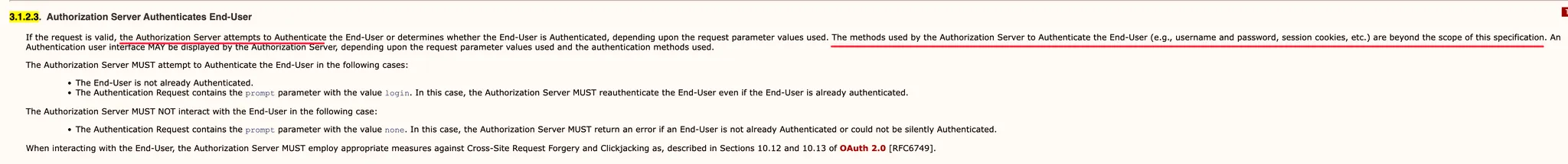 OIDC 문서에서는 authorization server가 인증을 수행할 책임이 있다고 설명합니다. 인증 방법은 다양한 방식으로 구현할 수 있다고 명시되어 있습니다.