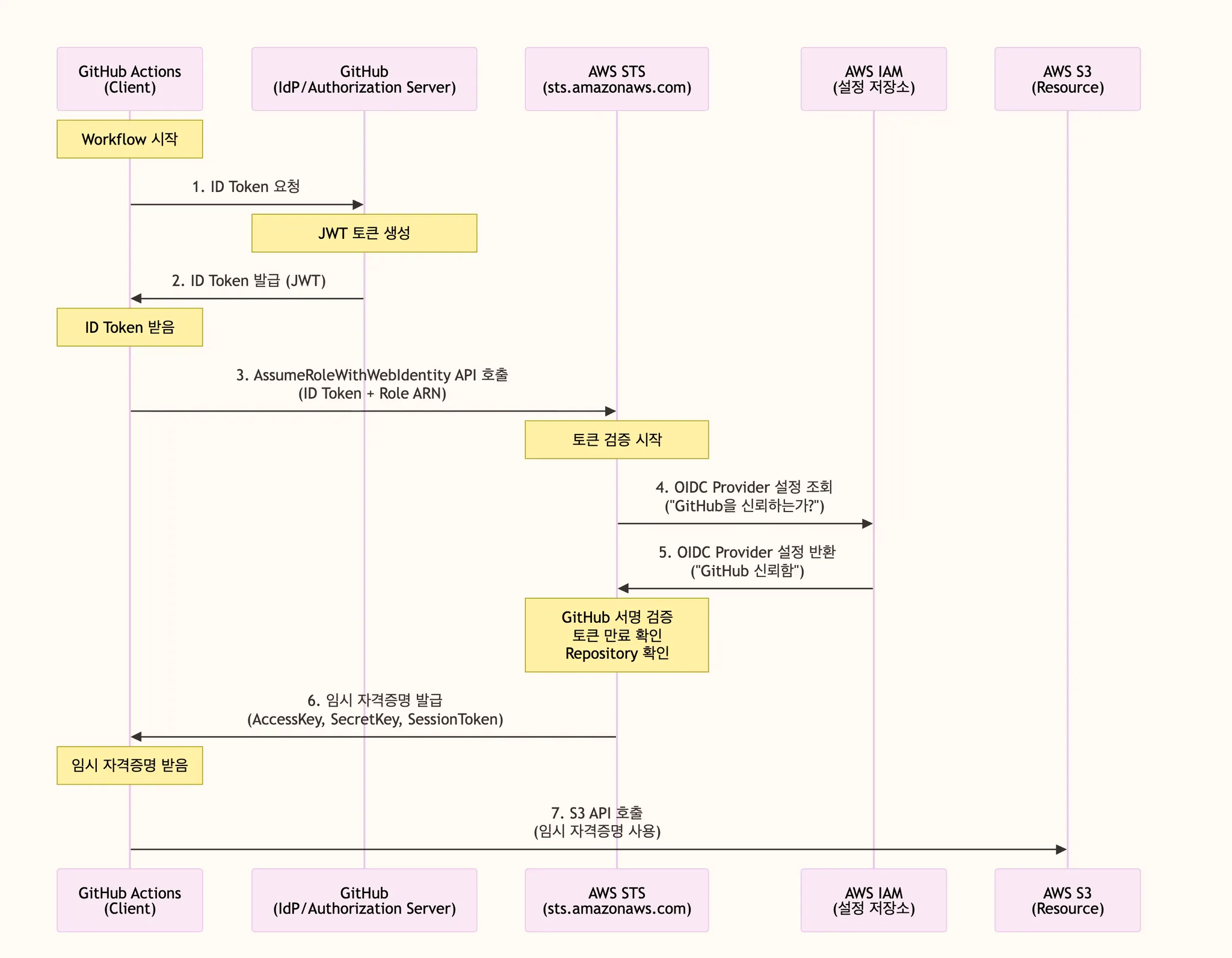 GitHub Actions는 assume role을 할 때 GitHub Authorization Server가 발급한 ID 토큰을 함께 전달합니다. 그리고 AWS는 받은 GitHub ID 토큰이 유효한지 검증합니다.