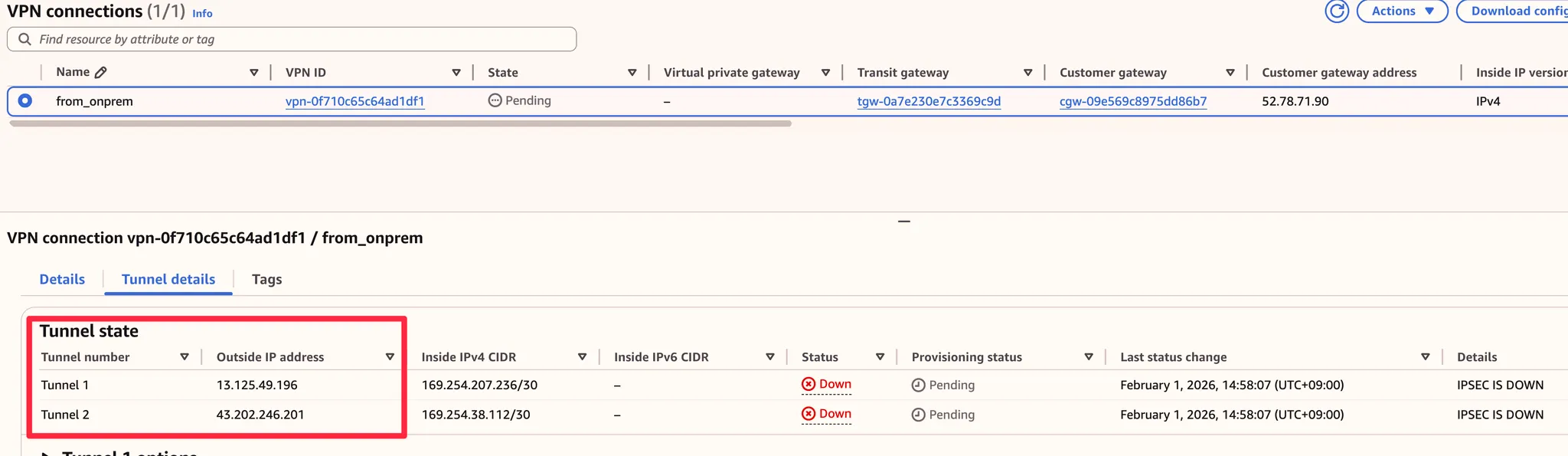 AWS Site to Site VPN을 만들면 기본으로 VPN터널 2개를 제공합니다. VPN구축과정에서 2개의 VPN터널을 연결하면 터널 이중화가 됩니다.