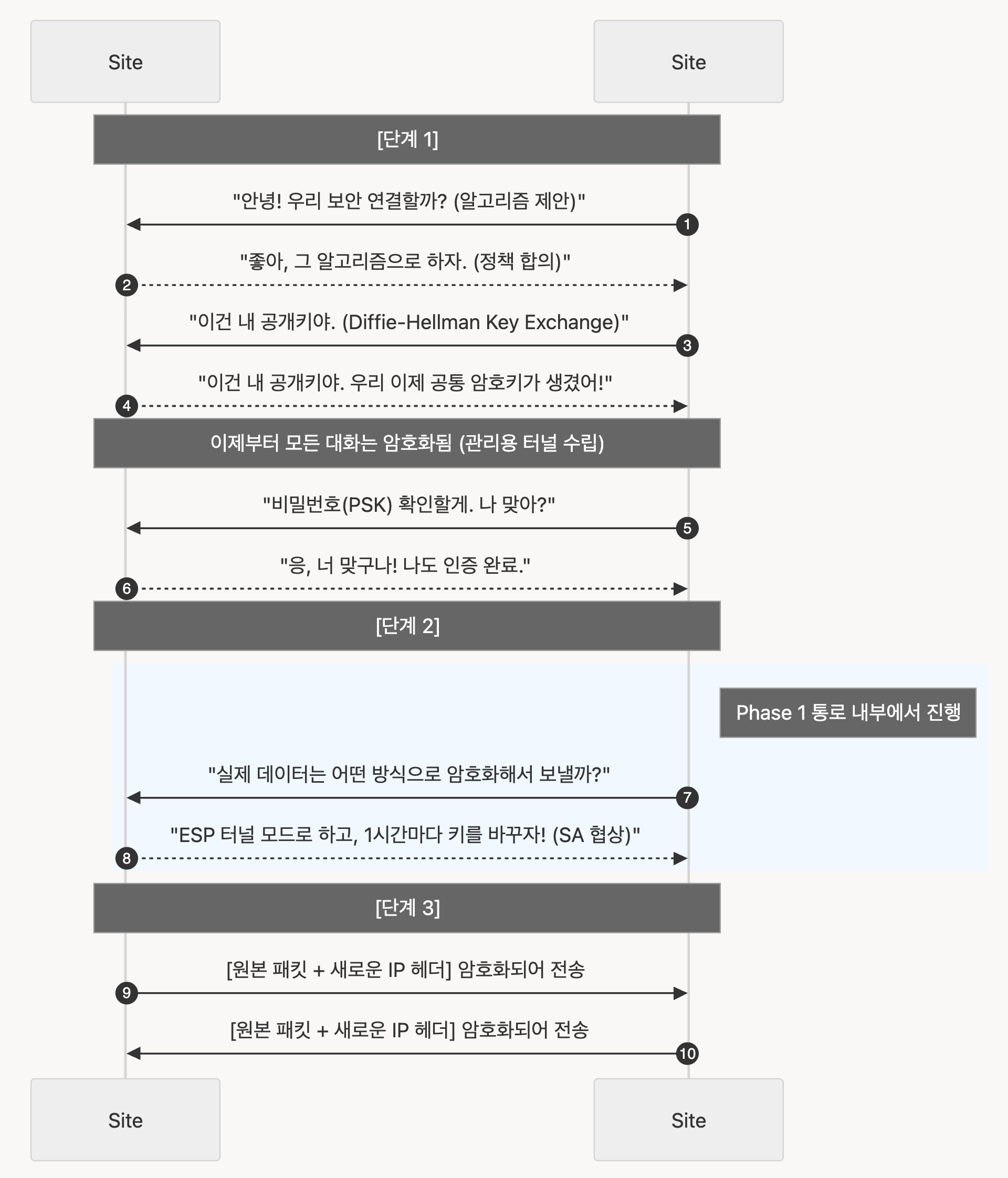 - 인증서: Private CA를 사용해 각 사이트에 인증서를 발급합니다. IKE 협상 과정에서 각 사이트는 Private CA의 공개키로 상대방의 인증서를 검증합니다.