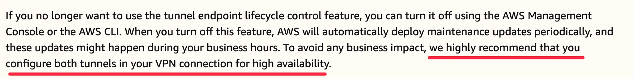 AWS Site to Site VPN을 사용한다면, VPN 터널이 주기적으로 끊긴다는 사실을 알아야합니다. AWS는 보안패치 등을 위해 정기으로 유지보수(maintenance)를 합니다. 이 작업이 진행되는 동안 VPN 터널 연결이 끊길 수 있습니다.