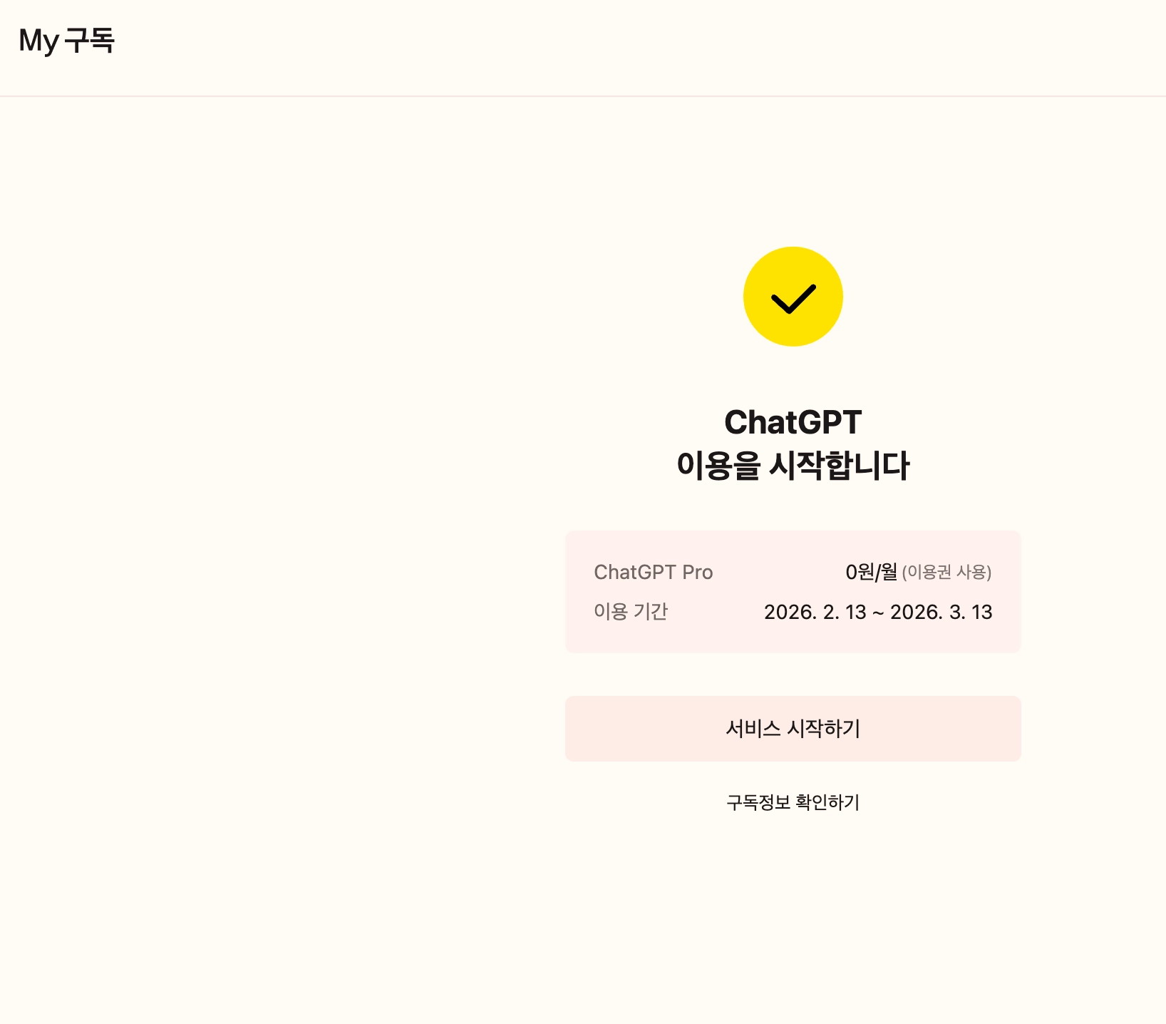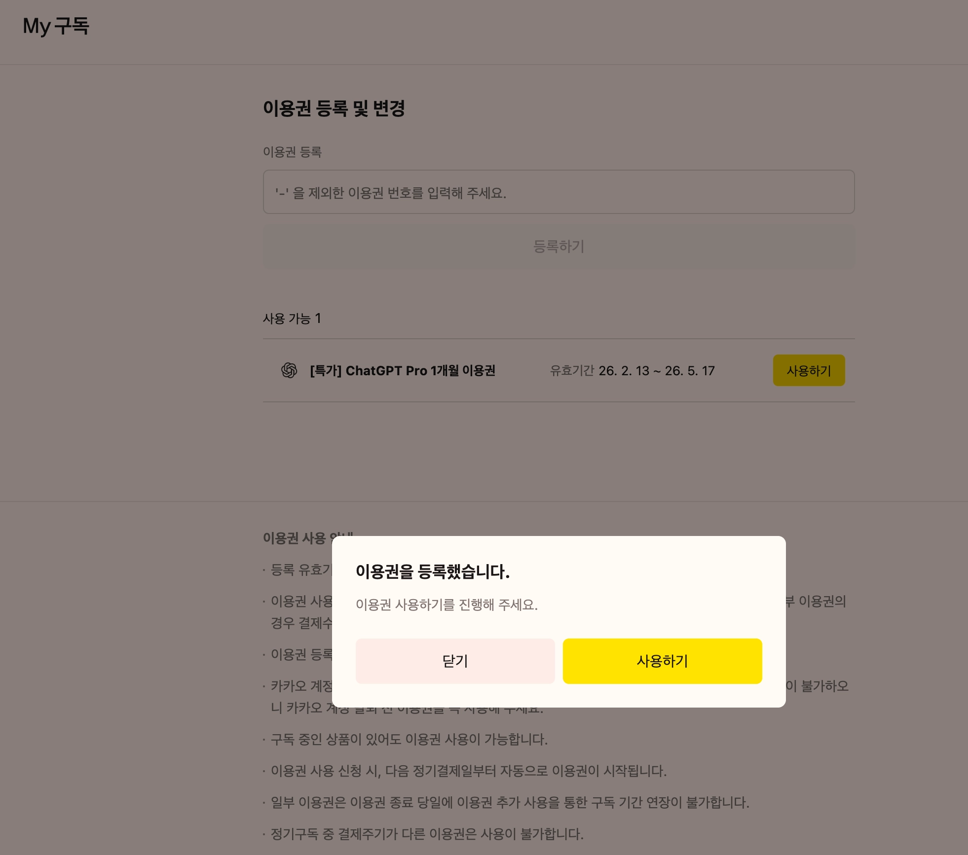 3. ChatGPT Pro 1개월 이용권 번호를 입력합니다. 번호가 올바르면 "이용권을 등록했습니다"라는 문구가 나타납니다. "이용권 사용하기"를 클릭합니다.