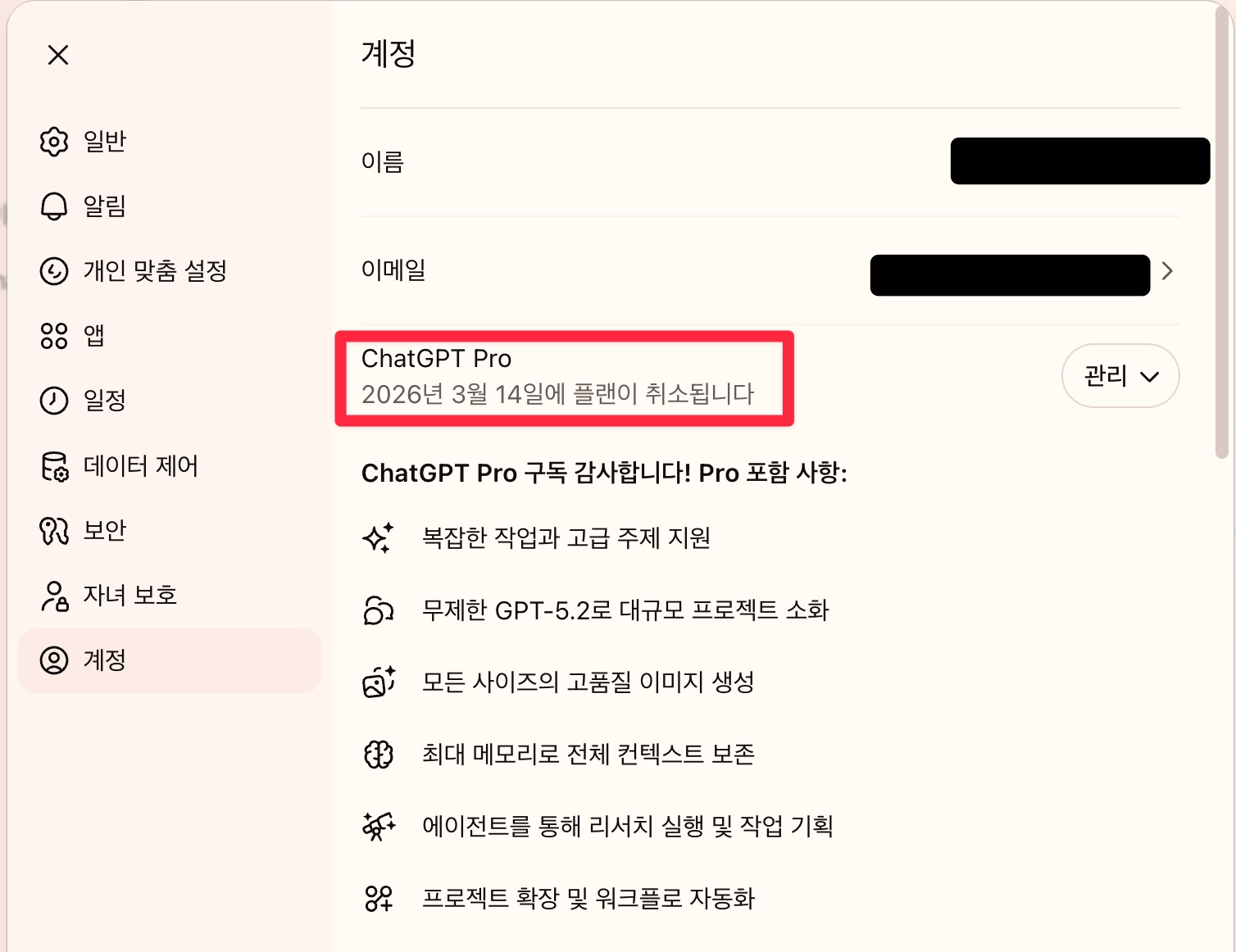재밌는 건 이 이벤트 이용권이 ChatGPT 요금제와 연동됩니다. 그래서 ChatGPT pro 290,000원짜리 요금제를 29,000원에 한 달 동안 사용할 수 있습니다. 아래 그림은 카카오 이용권 등록 후 ChatGPT에서 확인한 요금제 화면입니다.