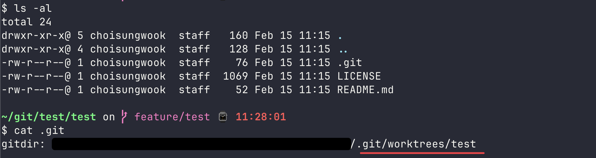 worktree의 특징은 원본 “.git”폴더를 같이 사용한다는 점입니다. worktree의 “.git”은 폴더가 아니라 파일로 되어 있고, 파일 내용에는 원본 “.git”의 경로가 적혀 있습니다.