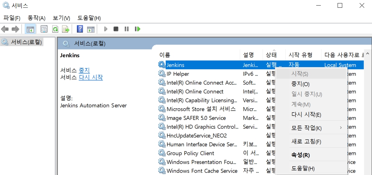jenkins서비스를 찾아 오른쪽 버튼 마우스를 클릭하고 시작을 누릅니다.