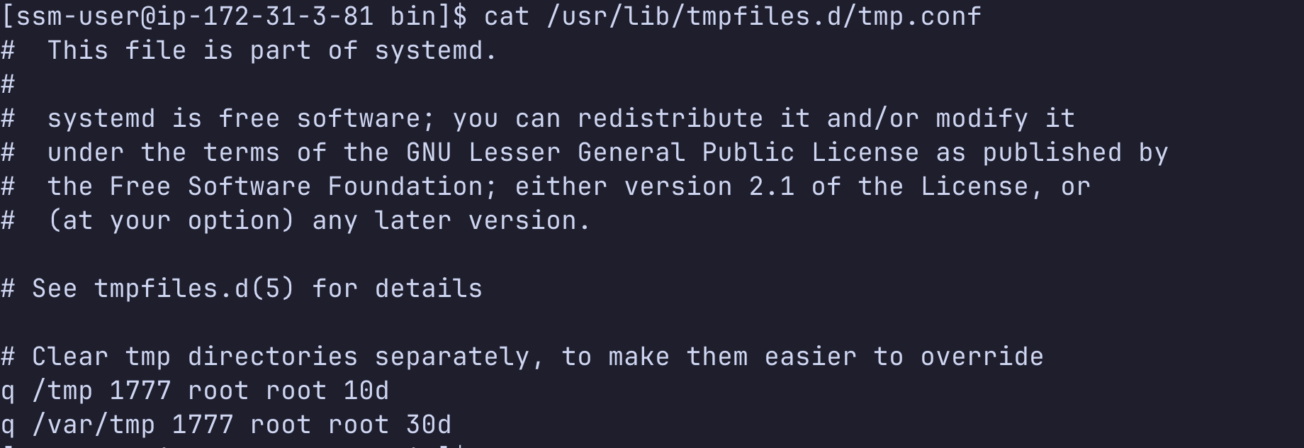데몬 설정은 tmp.conf 파일에 따릅니다. 아래는 AL2023 리눅스의 기본 설정입니다. 이 설정은 /tmp 디렉터리를 10일마다 삭제합니다. 또한, 시스템이 재부팅되면 /tmp 디렉터리 파일을 삭제합니다.