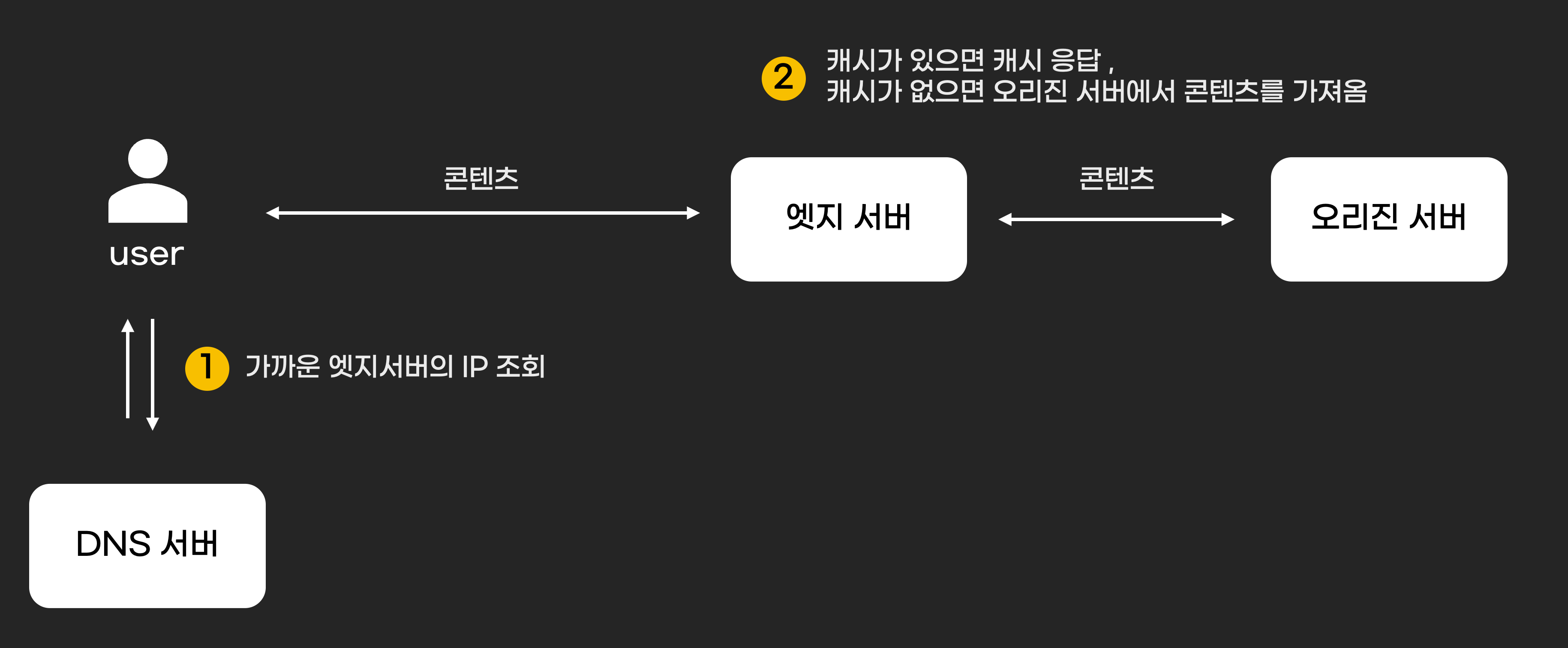 엣지 서버는 사용자가 요청한 콘텐츠가 캐시 목록에 있으면 가지고 있는 캐시를 그대로 사용자에게 응답합니다. 캐시가 없다면 오리진 서버에서 콘텐츠를 가져와 캐시를 저장하고 사용자에게 응답을 줍니다.