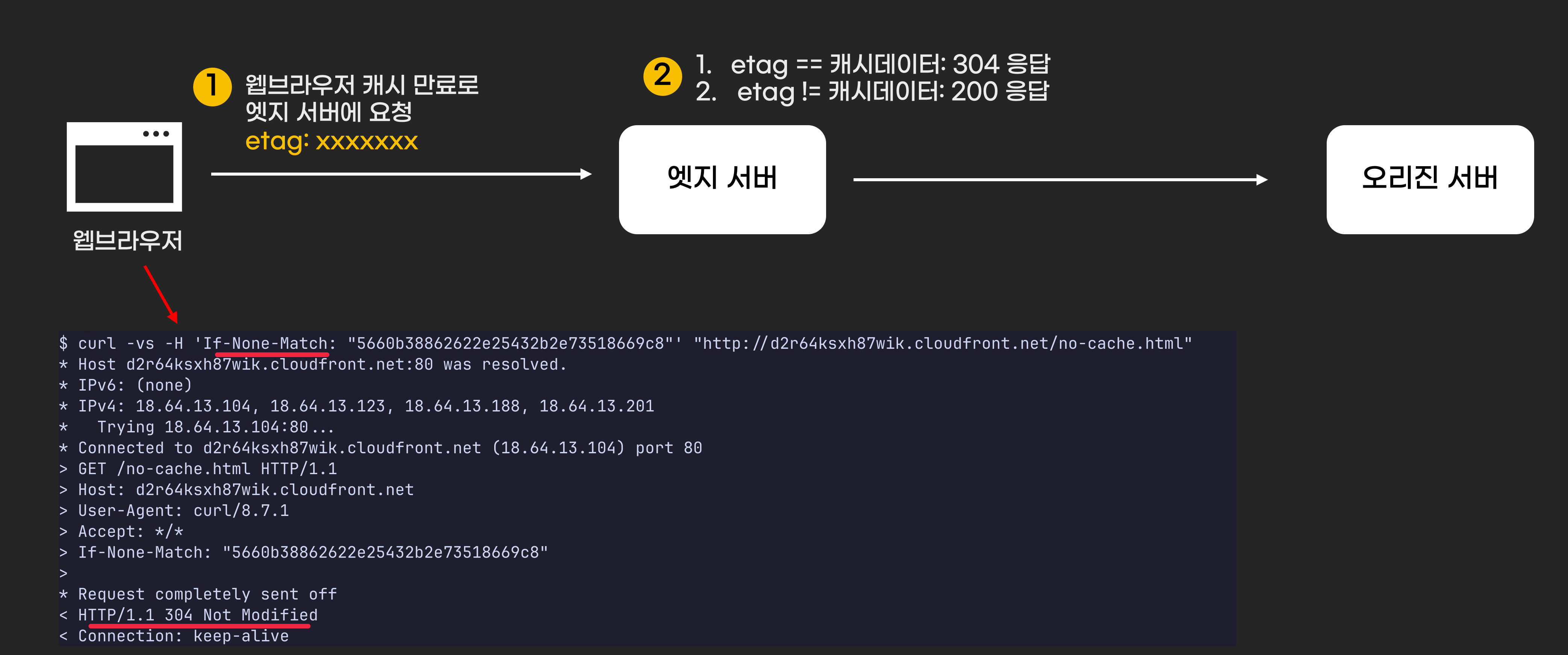 엣지 서버는 받은 ETag를 보고 요청의 콘텐츠와 엣지 서버의 캐시 데이터가 일치하는지 비교합니다. 만약 같다면 엣지 서버는 콘텐츠를 주지 않고 304 Not Modified 응답을 줍니다. 반대로 ETag와 엣지 서버 캐시 데이터가 다르다면 200 응답을 주고 웹 브라우저가 요청한 콘텐츠를 줍니다. 이 과정을 조건부 요청이라고 합니다.