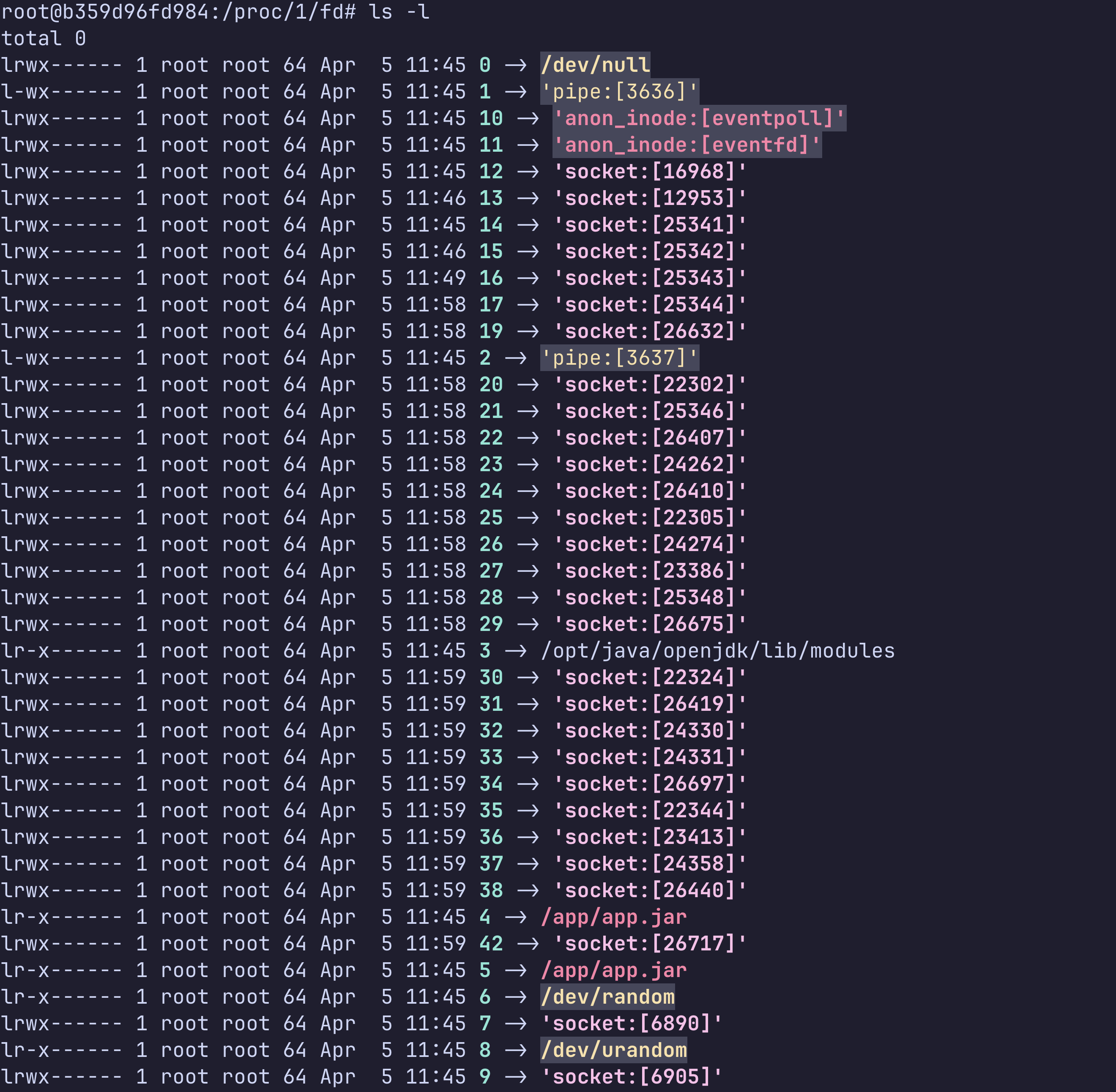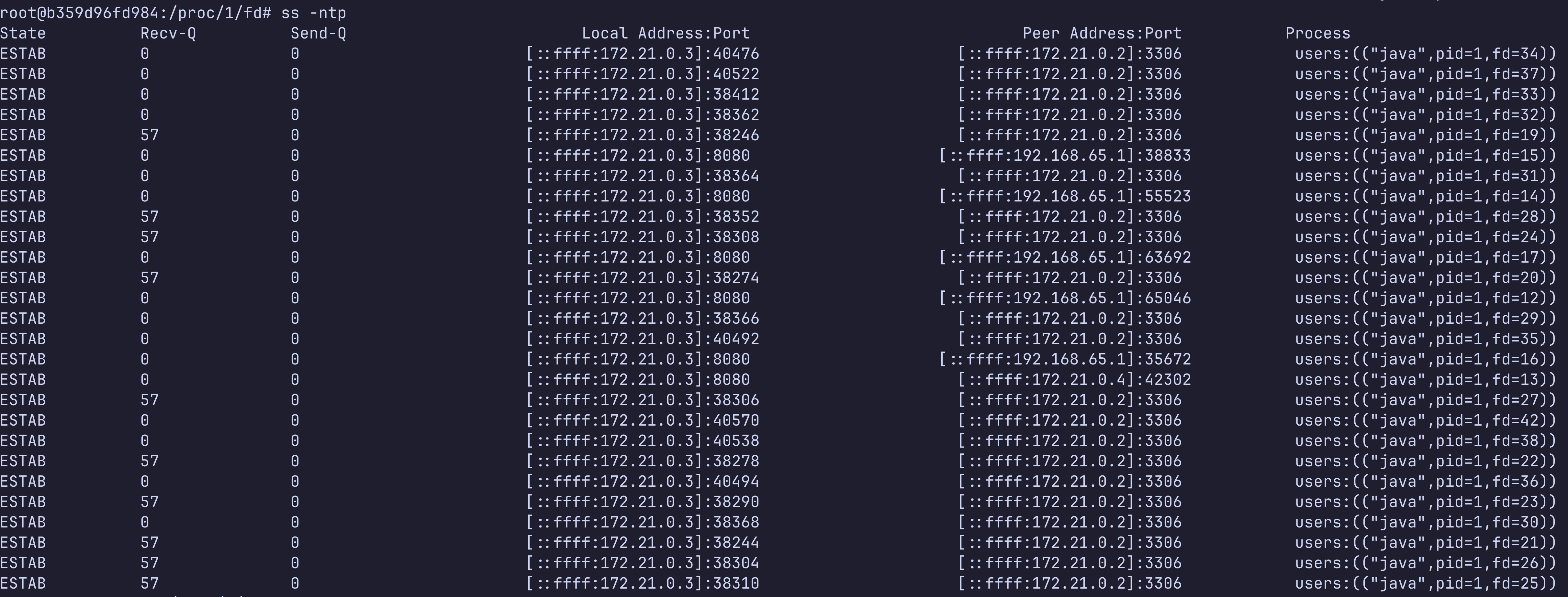 Spring Boot 컨테이너를 확인하면 fd가 대량으로 쌓여 있었습니다.