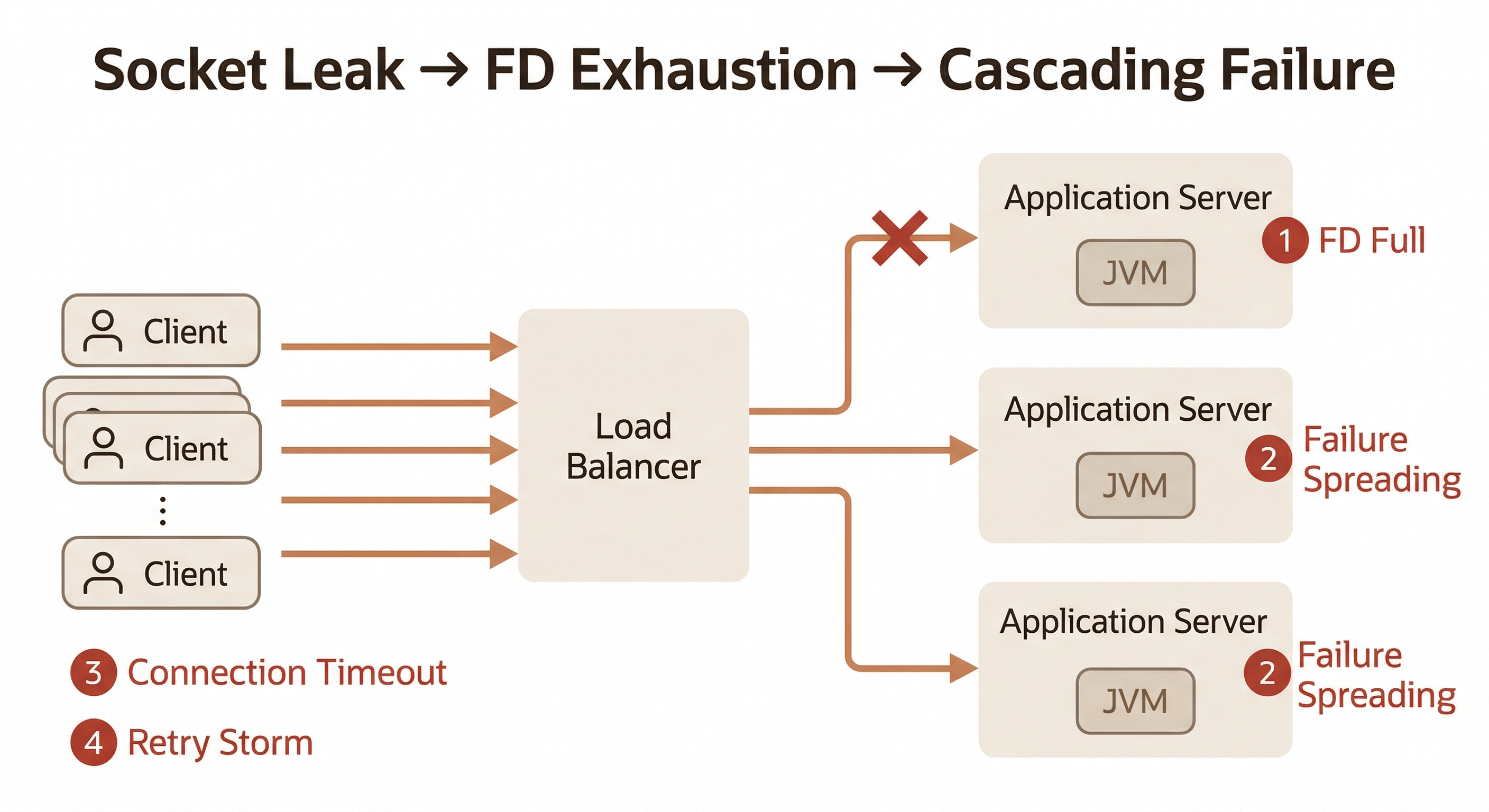 fd는 무한히 만들 수 없어 소켓 누수가 계속되면 fd를 고갈시킵니다. 이 영향으로 소켓, 파일 등 입출력 리소스를 생성하지 못하고 Too many open files 에러가 발생합니다.
