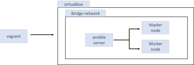 vagrant로 virtualbox VM생성을 자동화 했습니다. 최소 VM 3개(ansible server, 쿠버네티스 마스터노드, 쿠버네티스 워커노드)를 생성합니다. 스크립트를 수정하면 워커노드 갯수를 늘릴 수 있지만 그만큼 필요사양이 높아집니다. 모든 VM은 centos7 리눅스 배포판입니다. 네트워크는 bridge로 구성했습니다.