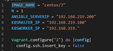 윈도우 시스템으로 예를 들면 ipconfig명령어로 현재 IP대역을 확인합니다. 그 다음 Vagrantfile 최상단에 위치한 IP변수 3개에 적절하게 IP를 입력합니다. ANSIBLE_SERVERIP는 ansible 서버 ip, k8sMASTER_IP는 쿠버네티스 마스터 노드의 ip입니다. k8sWORKER_IP는 쿠버네티스 워커노드 ip인데 ip전체를 적지 말고 호스트 ip영역은 비워주셔야 합니다. 워커노드의 갯수만큼 실행 중에 ip를 생성하기 때문입니다.