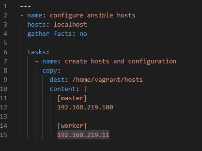 ansible이 쿠버네티스 VM을 인식하기 위해 ansible_workspace/add_hosts.yaml을 수정합니다. 워커 노드는 IP 11번부터 시작해서 Vagrantfile에 설정한 N만큼 1씩 입력합니다. 예를 들어 N=1이면 192.168.219.11 ip 1개를 입력하지만 N=2이면 192.168.219.11, 192.168.219.12 총 2개를 입력해야 합니다.