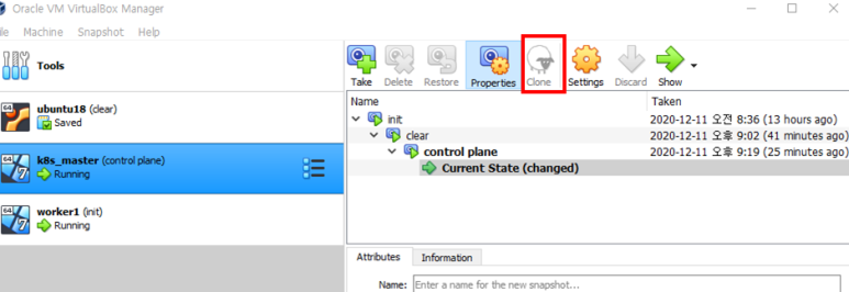 쿠버네티스가 설치된 상태에서 VM을 종료합니다. 그리고 CLONE버튼을 클릭하여 복제합니다. 복제한 VM은 워커노드로 사용됩니다.