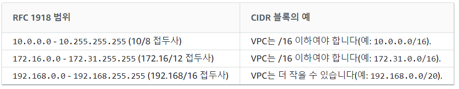 CIDR은 가상 네트워크 IP대역이을 의미하고 RFC1918 표준에 따라 A,B,C급 private IP영역을 설정해줘야 합니다.