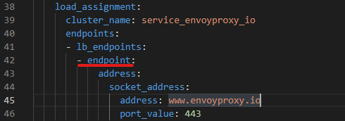 envoy홈페이지로 이동된 이유는 42번째 줄에 있는 endpoint설정때문입니다. endpoint를 관리하는 최상위 그룹이 cluster입니다.