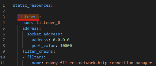 envoy proxy가 10000포트로 리스닝하는 이유는 listeners에 설정이 되어 있기 때문입니다.