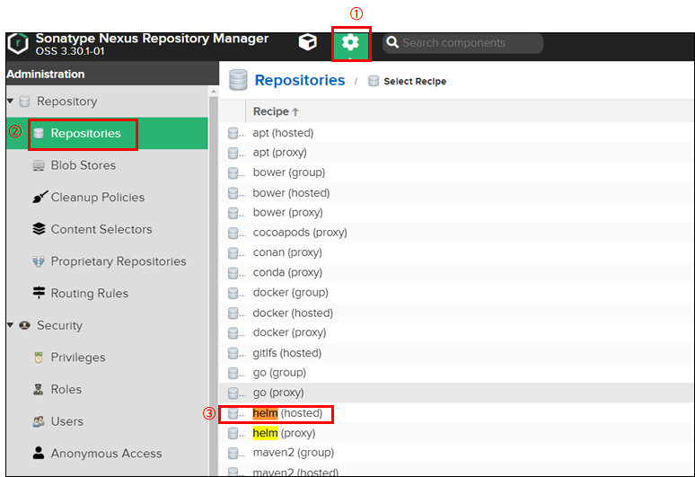 목차 pdf자료는 slieshar(https://www.slideshare.net/sungwookchoi5/nexus-helm-dockerhelm-repo)에서 보실수 있습니다. 안녕하세요. 이 글의 목표는 2가지 입니다. 1. nexus에 private helm 저장소 생성 2. nginx, springboot helm 차트 생성하고 업로드 https://youtu.be/wQ5RDxXTrgg 1. 준비 https적용된 nexus helm 설치 helm install, upgrade, package명령어 이해 2. private helm repo 생성 helm hosted생성 페이지로 이동합니다. ① 톱니바퀴 버튼을 클릭합니다. ② Repositories메뉴로 이동합니다. ③ helm hosted을 찾아..